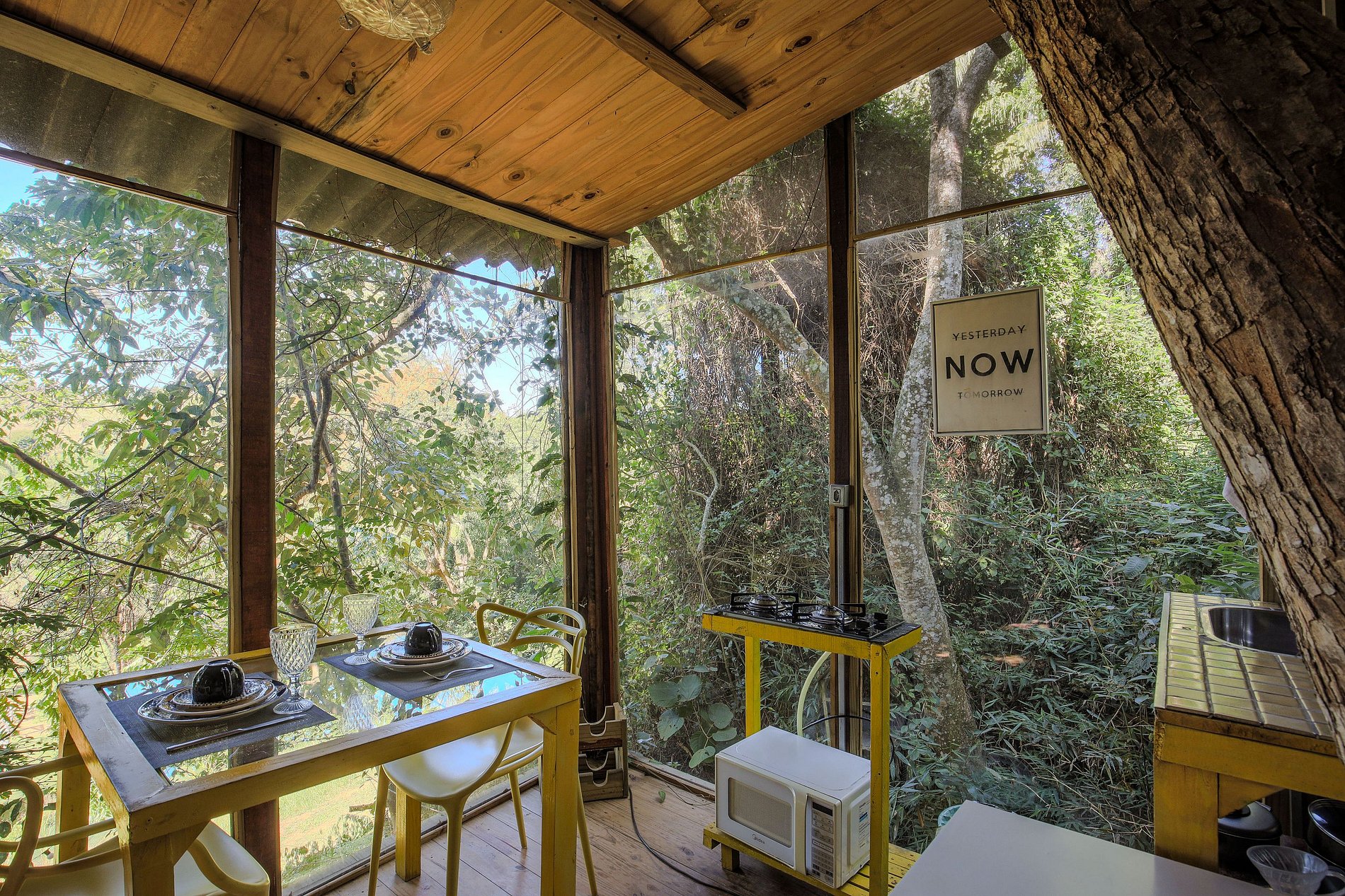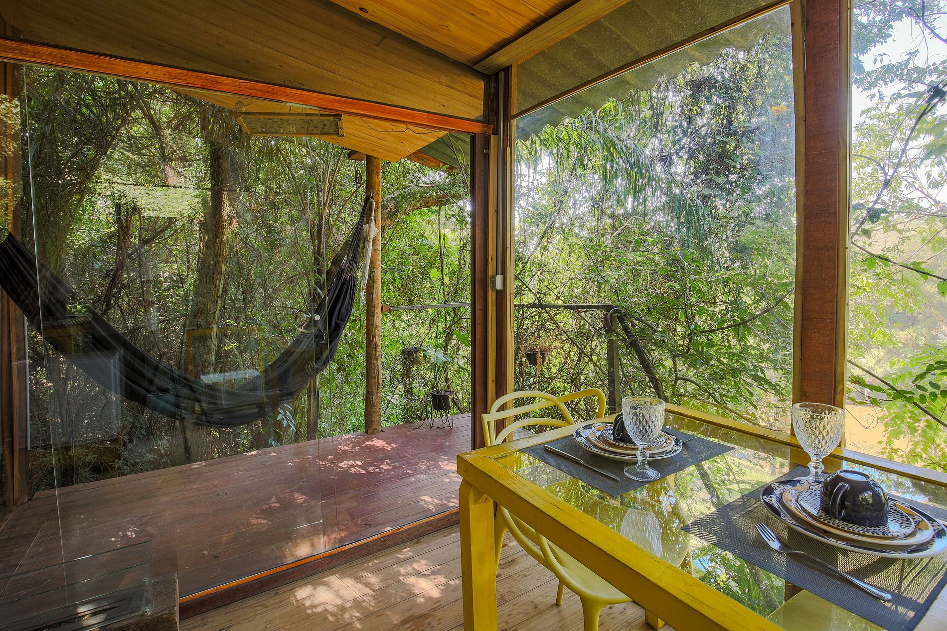 Relaxe neste lugar único e tranquilo. Casa inteira de vidros e rodeada de mata (estadia integrada à natureza, com conforto e romantismo). Sente na varanda aprecie o sol nascer. Pequena cozinha com utensílios. Acesso gratuito ao lago, caiaque, cascata, piscina, PetFriendly (pets dóceis c/ humanos e animais). Crianças > 13 anos Fogo de chão / churrasco de parrilla. Aqui habitam insetos e pequenos bichos. Alguns restaurantes entregam; temos um mini-mercado.